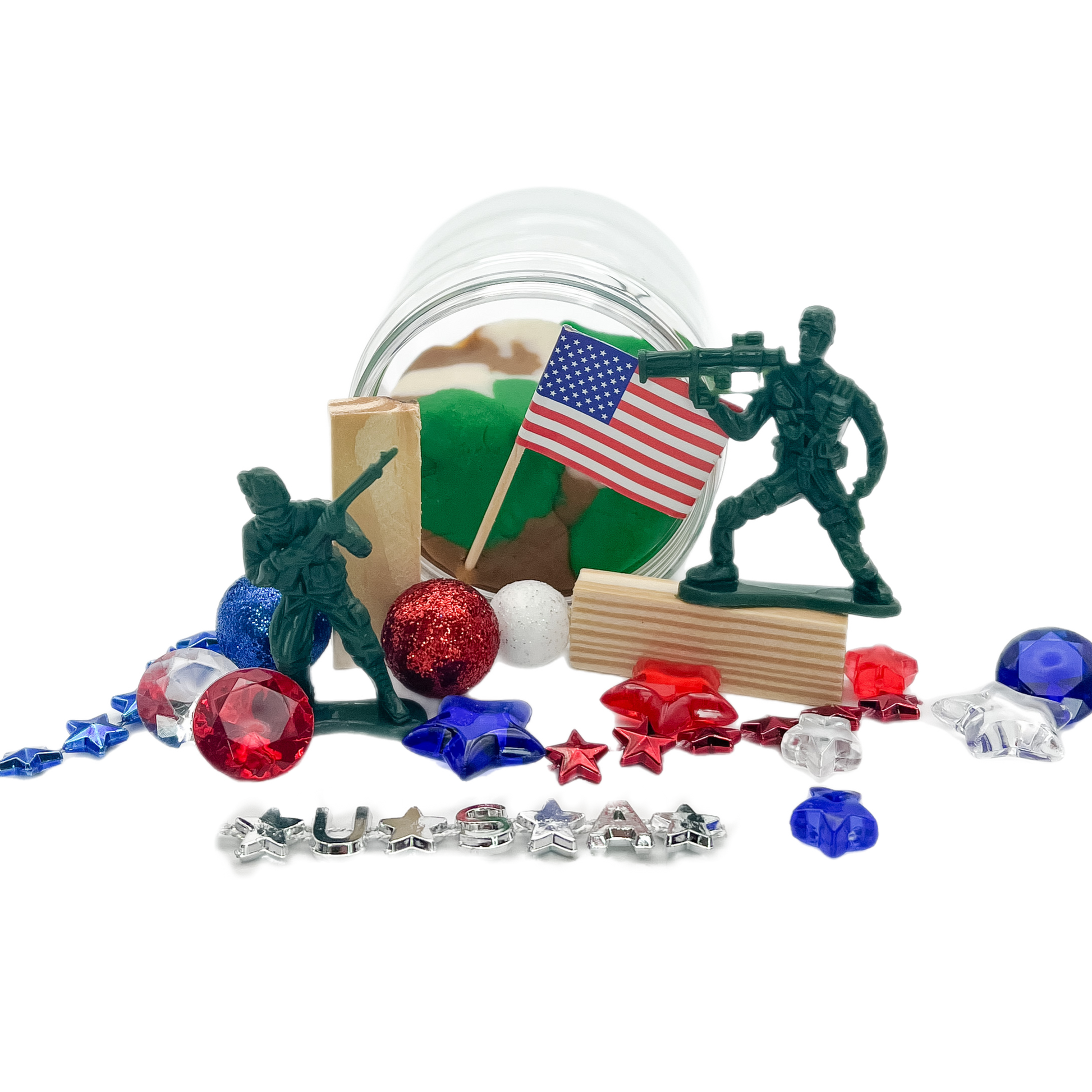 Enhance your child's playtime with the delightful In The Army Bizee Jar! Our homemade non-scented playdough is perfect for little hands, offering a soft and moldable texture that ignites creativity. Uncover a world of endless possibilities as your child discovers the army men figurines nestled inside, ready for exciting adventures! Stand back and watch as they create their very own battlefield, complete with an adorable American flag waving high. Let the colors of red, white, and blue fill their playtime with pride and inspire imaginative play that knows no limits. The In The Army Bizee Jar is a sensational gift for little heroes in training!