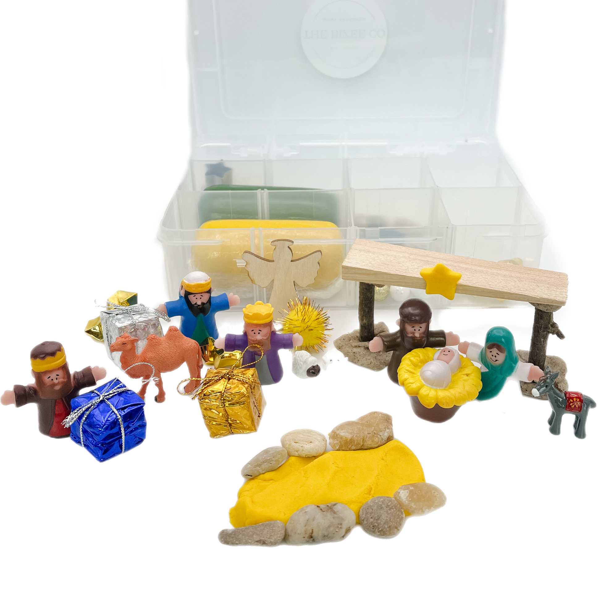 Introducing our Nativity Bizee Box - the perfect way to bring the story of Christmas to life! Inside this adorable box, you'll find everything you need to create your very own nativity scene. From homemade unscented playdough to sand dough, and Mary, Joseph, and baby Jesus. The set also includes a stable, animals,an angel, the wisemen, and a star mold to complete the scene. Get ready for hours of imaginative play while you bring the first Christmas scene to life.