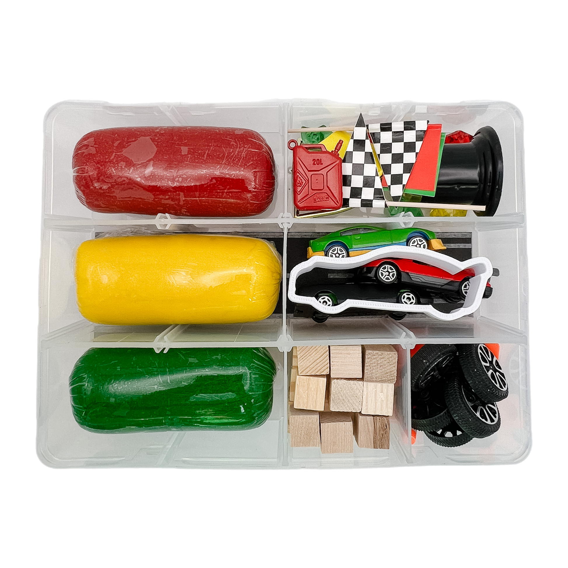 Inviting all the creative young minds to enjoy and immerse themselves in the world of racing with Race Car Bizee Box! The box comprises of homemade unscented playdough, safe and fun for your children. They can race the included cars or utilize the car cutter for designing their fleet of race cars, adding details like tires, and arranging cones over the track. The set includes a green, red, yellow, and white flag that can be used to signal the start and end of the race. And once the race is over, don't forget the shiny trophy for the champion! The Bizee Box is sure to ignite your child's imaginative streak and provide hours of excitement.